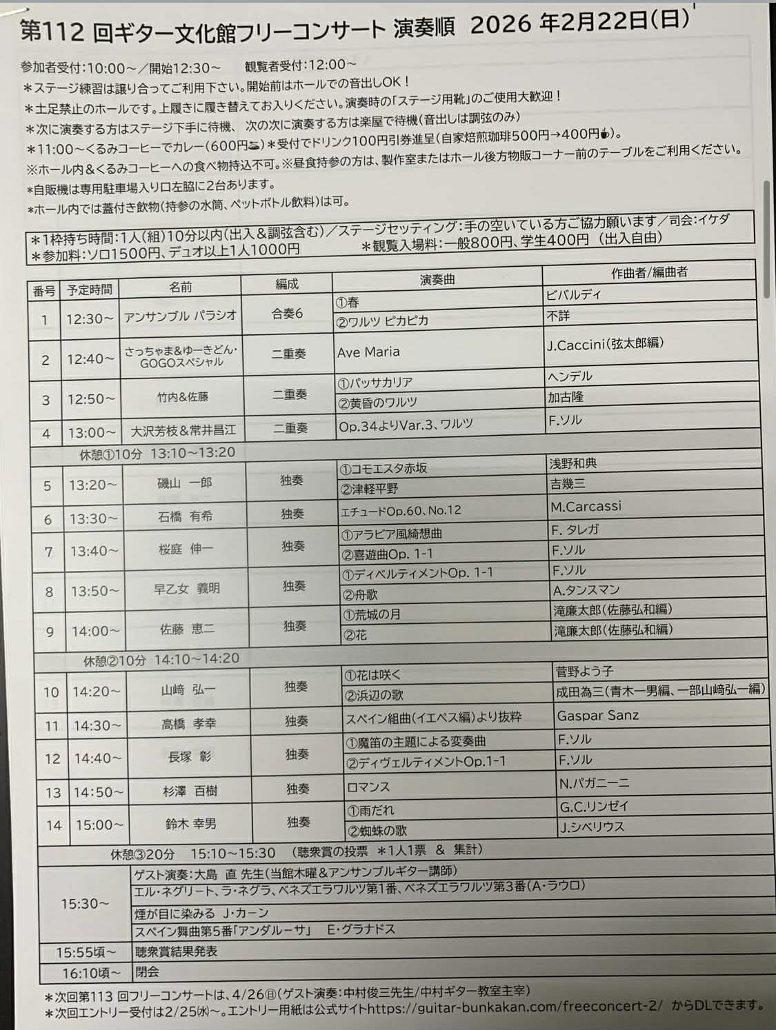 次回の第113回フリーコンサートは、