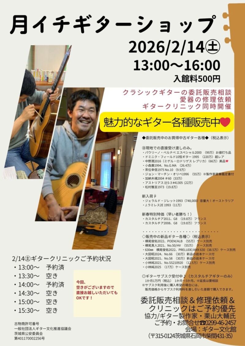 2/14㊏は、月イチギターショップ開店しました(13時~16時) 次回の月イチギターショップ&ギタークリニックは、♪3/15㊐13時16時に開店します。※ギタークリニックご予約受付中♪13:00~空き13:30~空き14:00~空き14:30~空き15:00~空き15:30~空き