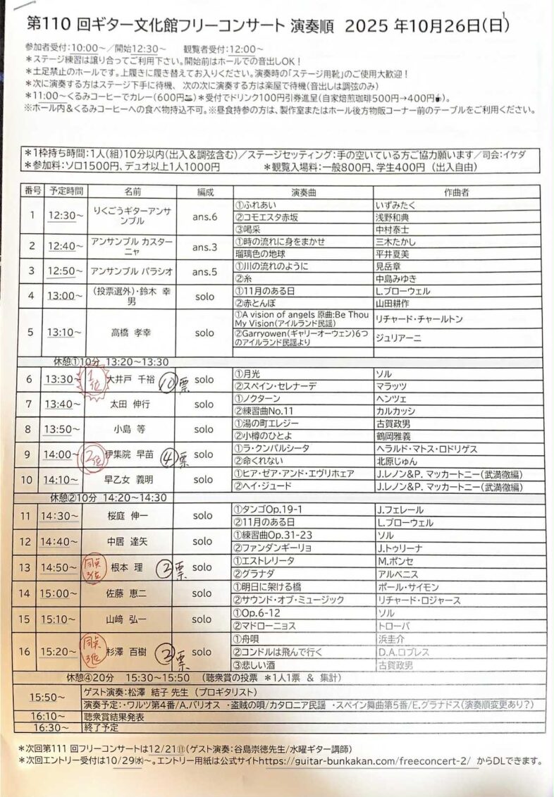 *ソロ参加料:1500円、二重奏以上1人1000円(当日精算) 1枠:1人(組)10分以内(出入&調弦含む)