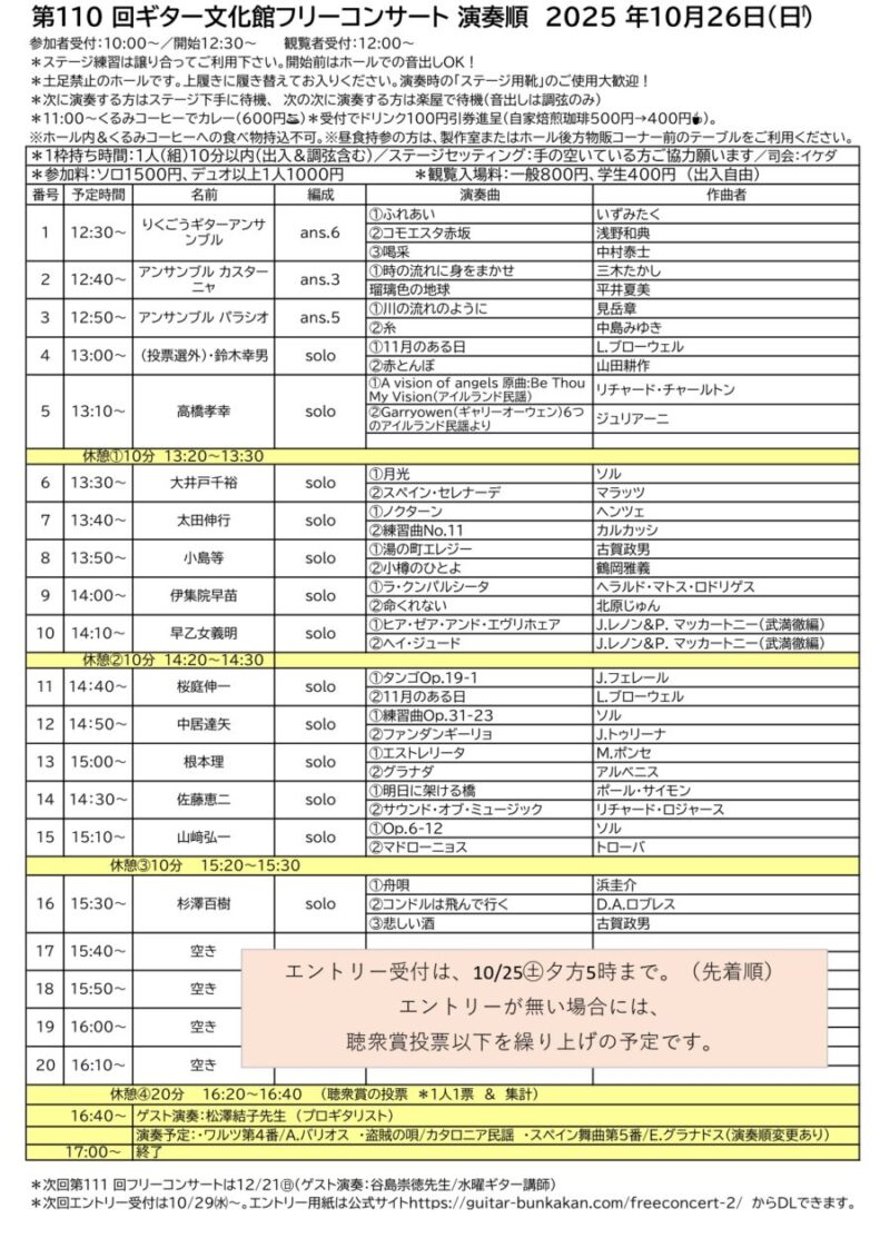 10/24付け・都合により演奏順&空き状況が変わりました。あと4枠、空きがございます。ギター以外の楽器もOk!(〆切は10/25㊏夕方5時まで)